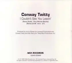 "I Couldn't See You Leavin'" is a song written by Ronnie Scaife and Rory Bourke, and recorded by American country music artist Conway Twitty. It was released in December 1990 as the second single from his album Crazy in Love. The song reached #3 on the Billboard Hot Country Singles & Tracks chart in 1991.[1] It was Conway's final Top 10 hit.