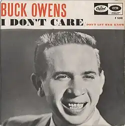 "I Don't Care (Just as Long as You Love Me)" is a 1964 single by Buck Owens, and was his fourth number one on the country chart. "I Don't Care (Just as Long as You Love Me)" spent six weeks at number one and a total of twenty-seven weeks on the chart.[1] The B-side of the song, "Don't Let Her Know", peaked at number thirty-three on the country chart.