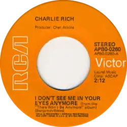 The song received renewed popularity in 1974, when country singer Charlie Rich released a cover version he had recorded during the mid-1960s. Rich's version came about during his stint at RCA's rhythm and blues subsidiary, Groove Records, and association with producer Chet Atkins, one of the architects of the Nashville Sound. Like many of Atkins-produced songs of the era, "I Don't See Me ..." featured choral backing and strings, a style prominent on other Rich recordings of the time. Allmusic reviewer Stephen Cook said that Rich's musical style "landed somewhere between the raw sound of his Sun hits ... and the pop crossover tone of his Epic smashes."[2]