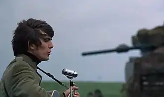The premise and the level of security afforded the band mirrored the adulation they received in real life, at the height of Beatlemania.[43][59] Media theorist Stephanie Fremaux comments on the imagery employed by director Richard Lester in his harsh editing and shots of soldiers and weaponry to convey a sense of threat, and how this is furthered by the Beatles', and particularly Harrison's, apparent hostility and avoidance of eye contact with the camera.[59] Film historian Stephen Glynn highlights a shot that features Harrison in profile, singing into a metallic microphone, and the corresponding gun barrel of a tank as an example of Lester making "visual parallels between the tools of the musician and the military". Another example, according to Glynn, is an aerial shot of the band encircled by six tanks that cuts to a close-up of the fretboard of Harrison's guitar, with the focus soon changing to reveal Stonehenge in the near distance.[60][nb 6]