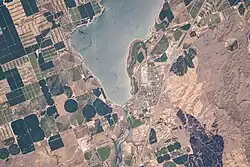 Satellite view of the southern end of SH-39, as it passed along the northern edge of American Falls and wraps about the southern end of the American Falls Reservoir, June 2021