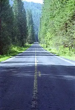 Between Harvard and Emida, the route crests at an elevation of about 3,600 feet (1,095 m) above sea level. This is a park 'n' ski lot (Palouse Divide) for cross-country skiing,[3] and the turnoff to North–South Ski Bowl, a defunct alpine area which is now a private conference and retreat lodge.[4][5]