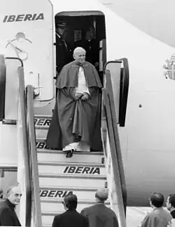 In 1970, when the Hugocarlista domination was not yet complete, the Madrid party branch nominated Larramendi to take part in a gathering in Arbonne, styled as a would-be platform for compromise between the Progressives and the Traditionalists.[62] Considered a representative of the Traditionalists but not involved in the internal party struggle he seemed an in-between delegate and indeed adopted a conciliatory stance. In what sounded like a distant echo of the pro-social writings of his father, Larramendi declared that if the party was to embrace socialist ideas its members should act instead of talking, and that he would start with himself.[63] The point was about his position as a corporate business leader, but most of those present took it for support of Don Carlos Hugo.[64] They were soon proven wrong; Larramendi stayed out of the newly emergent Partido Carlista and in 1975 addressed his king, Don Javier, with a joint letter, in ultimative terms demanding confirmation of Traditionalist principles.[65] As the claimant abdicated in favor of his son, the Traditionalists addressed Don Carlos Hugo with another letter; Larramendi was not among the signatories for neither this nor the following document, marking an ultimate break with the new claimant. In the mid-1970s he loosely neared Sixtinos,[66] but refrained from political activity after the death of Franco.