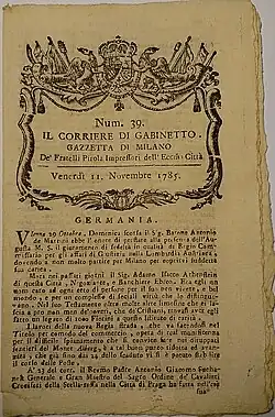 The brothers Giacomo and Gaetano Pirola were active as typographer in Milan from 1781.[1] In 1782 they obtained the authorization of the government and started the publication of the Giornale Enciclopedico di Milano - Notizie Storico Politiche (in English: Encyclopedic journal of Milan, historical and political news). [2] On 1 July 1785 that newspaper was discontinued and the first number of the Il Corriere di Gabinetto - Gazzetta di Milano (in English: Courier of Cabinet, Gazette of Milan) was issued always by the Pirolas. Sometime it had a literary supplement named Estratto della letteratura europea (in English: Extract from European literature).[3] The editor, in charge of choosing the news to publish and of writing them, was Gaetano Morandi, a priest from Genoa.[2] The newspaper had in 1789 about one thousand subscribers.
