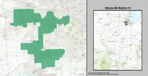 From 1865 to 1867, the district included Bureau, LaSalle, Livingston and Woodford counties.[3] From 1901 until 1947 the 11th congressional district included Kane, DuPage, McHenry and Will Counties. Following the Congressional Apportionment Act of 1947, the district covered a portion of Cook County and the far northwest side of Chicago roughly centered on Norwood Park.[4] The district was not changed by 1951's redistricting.[5] In 1961, the district was widened westward to the Des Plaines River and east into parts of Lincoln Square.[6] The district covered the northwest side of Chicago until the early 1990s when it moved closer to its current area, encompassing most of LaSalle and Grundy Counties, the southern part of Will County, the northern part of Kankakee County and a small portion of southeastern Cook County along the Indiana state line.[7] The Illinois Congressional Reapportionment Act of 2001 (10 ILCS 76) defined its boundaries following the 2000 U.S. census.