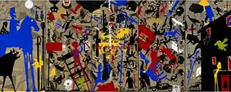 This large scale, multi-panel, colorful painting depicts the aftermath of Hurricane Katrina. Starting from the left panel:[1]