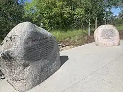Marianne Nicolson is painter, photographer, sculptor, and installation artist of the Dzawada’enuxw First Nation who has trained in traditional Kwakwaka’wakw carving.[19] Nicolson's installation title notes the nearby North Saskatchewan River and the piece contains many references to its formation, flora, fauna, and history of sustaining Indigenous peoples on its banks.[19] To create Preparing to Cross the Sacred River, Nicolson used eight quarried stone slabs of varying heights connected with smoothed river rocks.[20] The stone slabs are carved to look like petroglyphs, but with a more modern style that evokes beadwork, a traditional Indigenous method.[20] In her research for the project, Nicolson spoke with many elders who told her their traditional stories, which she used to inform the imagery carved on the stones: geese, magpies, other animals, flowers, and arrows to show movement and give direction.[20] The slabs also feature glyphs of a Métis cart and roses.[20] In an interview about the piece, Nicholson said, "Basically, the metaphor of ‘preparing to cross the sacred river’ speaks to the idea that there is a different relationship to the land that needs to be considered in order to halt environmental damage or climate change. This change can be considered as way of crossing into a new place or worldview that is anchored in Indigenous teachings."[20]