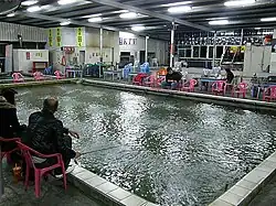 Indoor shrimping (釣蝦) began in Taiwan soon after outdoor shrimping became popular in its southern regions in the early 1990s.[2][4][5] Farmers opened the pools used to raise giant river prawns to the public for fishing; likely to compensate for the species's poor reaction to refrigeration and freezing.[2][5][6] This use of giant river prawns allowed farmers to capitalize on the greater ease of raising them compared to the more popular giant tiger prawn.[6] Indoor shrimping has since spread to Hong Kong and Singapore.[7][8][9] A Taiwanese-style shrimping venue opened in Houston in 2023.[10][11]