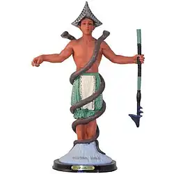 Inle is commonly depicted as a strong, healthy-looking warrior and hunter, with flowing hair in seven braids and fine, feminine features that give him an androgynous appearance.[1] He is always dressed elegantly, adorned in cowrie shells, coral, and beautiful feathers from the birds he hunts, and is often shown with snakes wound around him, recalling the association of snakes with healing as seen in the caduceus and staff of Aesculapius. Inle may also represented holding a staff, dagger, or a fishing hook . In nature, he is represented by fish. His colors are white, yellow, and blue, though some sources say indigo, turquoise, and coral.[2] His sacrificial victims are typically pure white as well.