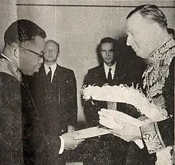 Belgian Ambassador Jean van den Bosch (right) presents President Joseph Kasa-Vubu (left) with his letters of credence