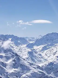 A lenticularis cloud (right) which was formed by a mountain wave, seen here over the Alps
