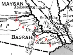 Map of the canals (nahrs) of the Basra region: 1. Abu al-Asad; 2. al-Marah; 3. al-Dayr; 4. Bithq Shirin; 5. Ma'qil; 6. al-Ubulla; 7. Abu al-Khasib; 8. al-Amir; 9. al-Qandil.