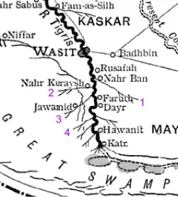 Map of the canals to the south of Wasit: 1. (A)ban; 2. Quraysh; 3. al-Sib; 4. Barduda.