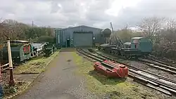 In 1971 the Northamptonshire County Council opened the Irchester Country Park, which is located on the site of the former opencast ironstone quarries. The park has a network of walks, a visitors centre and a children's play area in a grass and woodland setting. The museum was set-up within the park in 1987, inside a purpose built building to the west of the original ironstone railway maintenance yard. Access to the museum is along a footpath which follows the line of the ironstone railway trackbed. There are over 40 items of narrow gauge railway rolling stock including four steam locomotives and six diesel locomotives. A 250-metre long demonstration track with a gauge of 1,000 mm (3 ft 3+38 in) has been laid in the park.[2] The original water tank has been recreated using a tank of similar design, complete with lettering matching the original.