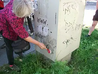 She began doing this work in 1986 after seeing a sticker at a bus stop near her home in Berlin demanding the release of Nazi war criminal Rudolf Hess. Shocked when she returned and found that no one had removed it, she decided to scrape it away with her keychain.[1][3] After this incident, she began to notice neo-Nazi and right-wing extremist graffiti wherever she went, and resolved to make removing it part of her daily routine. As of 2021, she had removed at least 90,000 stickers, with many of these preserved in binders for posterity, and effaced at least 10,000 spray-painted messages or symbols.[2] According to the New York Times, "Over her 30 years of scraping, dissolving and painting over far-right slogans, she estimates she has been assaulted three or four times. But, she said, she has also been hugged by strangers and thanked."[1]