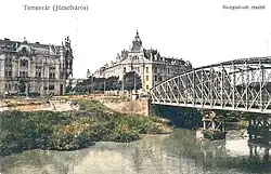 Before 1870, there were no solid bridges over the Bega River for a distance of over a kilometer, except for two: the Bishop's Bridge (now located next to Michael the Brave Boulevard), which connected the fortress to Maierele Vechi (the area of present-day Nicolae Bălcescu Square), and the Fabric railway station bridge (now General Ion Dragalina Bridge). Between the Peterwardein Gate of the fortress and the Maierele Noi neighborhood (modern-day Iosefin), only a wooden bridge existed. At the initiative of Mayor János Török, the construction of metal bridges across the Bega River began in 1870–1871.[2][3]