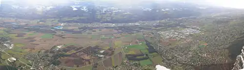 The lower valley constitutes a section of the Plain of Valence (also called the Valentinois)[7] and is characterized by the river's deep, winding channel. Instead of widening its banks over time, the Isère has dug deeper into its bed, forming stepped fluvial terraces. The valley has clearly defined borders and is relatively narrow, not exceeding 2 km (1.2 mi) in breadth.