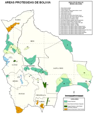 Isiboro Sécure National Park and Indigenous Territory (Territorio Indígena y Parque Nacional Isiboro Secure, TIPNIS) is a protected area and Native Community Land in Bolivia situated between the north of the Cochabamba Department and the south of the Beni Department (Chapare, Moxos, and Marbán provinces). It protects part of the Bolivian Yungas ecoregion.[1] The indigenous people living within the park belong to the Tsimané, Yuracaré, and Mojeño-Trinitario peoples. The southern portion of the park has been colonized by agricultural settlers, primarily coca farmers, since the 1970s. The Bolivian government estimates that 10% of the park has been deforested by their presence.[2]
