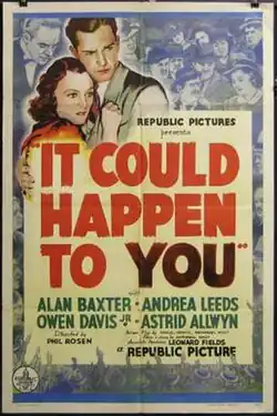 It Could Happen to You is a 1937 American drama film directed by Phil Rosen and written by Samuel Ornitz and Nathanael West. The film stars Alan Baxter, Andrea Leeds, Owen Davis Jr., Astrid Allwyn, Walter Kingsford and Al Shean. It was released on June 28, 1937 by Republic Pictures.[1][2][3]