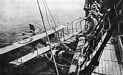 An FBA Type C in French service being hoisted above the French carrier French seaplane carrier Foudre, similar to the aircraft carried by Europa