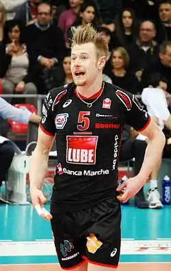 He started his career as a setter in 2004, but later moved to the outside hitter role. He started playing in Serie A1 at 16 years old. His first club was RPA-LuigiBacchi.it Perugia, where he played for two seasons. After this, he moved to M. Roma Volley. In the 2007/08 season, he played for Andreoli Latina. Then he came back to M. Roma Volley and played there until 2012, when he signed with Lube Banca Macerata. With this team, he won the Italian SuperCup in 2012 and the Italian Championship 2013/14.[1][2] On 9 May 2014 his departure from Lube was announced.[3] Then for two seasons, he was a player of Russian club VC Dynamo Moscow. He moved to of Al-Arabi SC in Qatar and won the Cup of Emir. Zaytsev came back to Serie A1 and joined Sir Safety Conad Perugia, the overall dominating Team of the 2017/18 season in Italy. Despite failing to reach Champions League final, after losing to Zenit Kazan again, the team managed to take the bronze medal. Zaytsev moves the following season to Modena Volley as Perugia announced that Wilfredo Leon would join the team, taking his spot. Zaytsev has also expressed the desire to play in his favorite role as opposite spiker again.