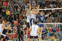Ivan Zaytsev (#9) during World Championship, scoring against USA in Kraków, Poland
