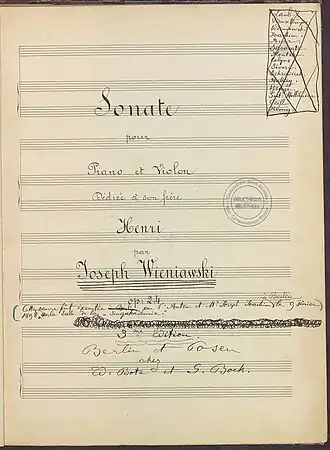 J. Wieniawski, title page of the Sonata for piano and violin (op. 24) dedicated to his brother Henryk (Library of the Royal Conservatory of Brussels, B-Bc, FC-3-W-019/1)