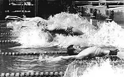 ![]() Jürgen Krüger (front) competing against Roland Matthes (middle) in the 1971 East German men's swimming Championship | |