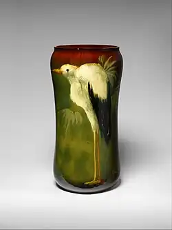 Owens Pottery was founded by J. B. Owens in Roseville, Ohio, in 1885.[1] In 1891 it moved to Zanesville, where Owens built a new factory on a site with its own rail spur.[2] It began producing art pottery in 1896, when it introduced the Utopian line with botanical decorations under a brown glaze.[3] All told, it produced some four dozen different lines of art pottery, with types ranging from vases, bowls, and pitchers to umbrella stands and lamps. Popular lines included Utopian, Lightweight, Lotus, Henri Deux, and Matte Green.[3][4] Especially distinctive lines include Red Flame (featuring slip decoration under a red glaze), Mission (depicting Spanish missions), and Coralene (featuring small bead decorations).[5]