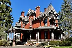 The three-story Smith mansion features Queen Anne architecture with Stick/Eastlake details. Built of brick and stone, the multi-gabled structure has two prominent towers, and is roofed in slate. A wrap-around porch connects to a porte-cochère.[4] The interior features stained-glass windows from Tiffany Studios and decorative terracotta panels.[8] Rich walnut, cherry, oak, ash, and mahogany woods are used to enhance the style of the rooms.[9] One addition was designed by Frank L. Bodine, architect of the Richardsonian Romanesque Somerville station.[10] In 1898, the architect Horace Trumbauer designed the library addition in the style of the Late Renaissance monarch Henry IV of France.[11] As historian Ursula C. Brecknell asserts: "The J. Harper Smith Mansion stands as an excellent example of the taste of a self-made man who became wealthy through his talents and his industry. Architecture was his status symbol, and he chose a lavish style."[5]