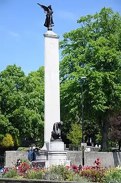 • War Memorial, Watchcote Park, Failsworth, Lancashire (1923); an "unusual" design with an octagonal fluted pillar, decorated with coloured tiles and capped with a bronze wreath and winged Victory figure (grade II)[7][35]