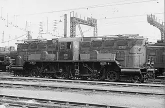 The ten-coupled Italian E550 of 1908 had paired motors, each with a jackshaft. A triangular rod was carried between these, rotating in synchrony and so always horizontal. This carried a sliding crankpin journal for the centre axle, and bearings for the long coupling rods to the unevenly-spaced pairs of drivers ahead and behind.[25] A similar arrangement was used for the Swiss Bern–Lötschberg–Simplon railway Be 5/7 1-E-1 of 1912.[26]