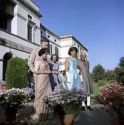 Kennedy was accompanied by her sister Lee Radziwill and her maid Providencia Paredes.[2] Following a visit to Pope John XXIII, they left Rome on the Air India flight and arrived at Palam Airport, New Delhi, on 12 March 1962, where Jawaharlal Nehru, then India's Prime Minister, and B. K. Nehru were there to greet her.[2][11] Having circled the airfield several times due to Kennedy not being ready, B. K. Nehru described her eventual appearance from the aircraft as "a vision of beauty, perfectly coiffed and clothed".[2] A red carpet had been rolled out on the runway and she was followed by her host, John Kenneth Galbraith, the United States ambassador to India.[12] Dinner on the first night was at Teen Murti Bhavan, Jawaharlal Nehru's residence.[2]