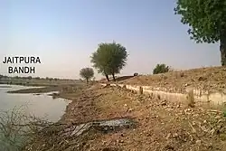 Jaitpura has a hot semi-arid climate under the Köppen climate classification "BSh",[2] receiving over 650 millimetres (26 in) of rainfall annually but most rains occur in the monsoon months between June and September. Temperatures remain relatively high during summer from April to early July having average daily temperatures of around 30 °C (86 °F). During the monsoon there are frequent, heavy rains and thunderstorms, but flooding is not common. The winter months of November to February are mild and pleasant, with average temperatures ranging from 10–15 °C (50–59 °F) and with little or no humidity and cold waves lead to temperatures near freezing.[3] It is having a big water dam which is the main resource for Ground Water Recharge and irrigation.