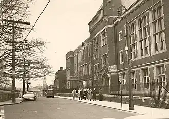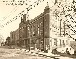 In 1849 Eliot became a high school, with boys and girls separated into different divisions. In 1855, the newly independent town of West Roxbury took control of the school and the girls’ department was moved to Village Hall on Thomas Street. In 1858 the boys’ department moved there as well, with the 24 Eliot Street location being leased to the town, which then used it as a primary school. In 1868, the Eliot High School moved to a new building on Elm Street. When the town of West Roxbury was annexed to the City of Boston in 1874, the trustees of the Eliot School withdrew their support and terminated their connection to the high school and decided to move back to the 24 Eliot Street building. During this time, the school became known as West Roxbury High, a name that appeared on the new building constructed at the Elm Street location in 1898. In July 1923, the school's name was changed to Jamaica Plain High.[4][6]