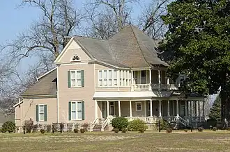 The James A. Walls House is a historic house on J. A. Walls Drive on the eastern fringe of Holly Grove, Arkansas. It is an irregularly-shaped 2+12-story wood-frame structure with a cross-gabled hip roof, projecting sections, and corner turret typical of the Queen Anne style. Its porch, supported by Tuscan columns, and front entry, with fanlight and pedimented bay, are typical of the Colonial Revival. Built in 1903 by a prominent local builder, is one of the community's finest examples of this transitional style. It is set on a handsome manicured lot over 2 acres (0.81 ha) in size.[2]
