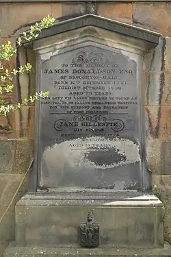 Donaldson died at Broughton Hall in 1830.[10] Shortly after his death, Broughton Hall's attached garden was converted into zoological gardens. He bequeathed £220,000 of his estate for the foundation of Donaldson's Hospital to maintain and educate poor children, with a preference for those named Donaldson or Marshall.[9]