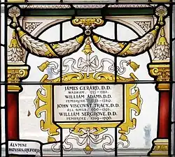 Stained glass in the Grundy Library at Abingdon School containing the name of James Gerard