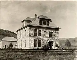 In 1884, James organized the Steamboat Springs Town Company with the financial backing of investors from Boulder.[7] With James as manager, the company laid out the town, sold lots, built a bathhouse, and promoted the town in diverse ways such as running the quarry and financing the first printing presses for the Steamboat Pilot newspaper. With the addition of the Suttle sawmill in 1883, the town grew rapidly over the late 1880s and 1890s. The Crawfords built a small frame house in 1886 and a large stone house in 1894, both within sight of their log cabin. In 1900, the Steamboat Springs Company incorporated the town, with James as the first mayor of Steamboat Springs. He continued to be instrumental in developing the land for the new town: half of the original town site lies on his homestead.[8]