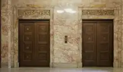 The east lobby includes the two elevators and main stairway for the building. The elevators are set into a marble surround and feature paneled bronze doors decorated with flower medallions. Each elevator surround includes a glazed, bronze-colored, plaster transom, inlaid with a floral motif. The partially enclosed, original stairway is located on the south end of the lobby opposite the two elevators. The stairway is made of marble treads, decorative bronze railing, and a simple wood handrail.