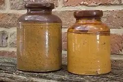 Sherwin Pottery jars are distinctive with their two toned glaze and no handles. The jars have a mustard coloured base and brown glazed upper portion encompassing the jars mouth. There are three etched lines at the coupling of the mustard and brown glazes. These rare examples seem to be all that survive of Sherwin Pottery, however it produced a huge array of serviceable pottery, as advertised in the Hobart Town Courier in 1835: bread pans, milk pots, cream pots, butter containers, cheese pans, baking dishes, hand basins, pipkins, flower pots, chimney pots, malt kiln tiles etc. Sherwin also played a role in producing earthenware for Hobart's infrastructure by making earthen made pipes for the supply of water.[4]
