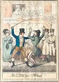 At the beginning of April 1821, Webster administered a public thrashing to Viscount Petersham, the future Charles Stanhope, 4th Earl of Harrington, in St James's Street, London. Webster accused Petersham, who had been flirting with his wife Frances, of damaging her reputation. There was a press report of the incident on 5 April, and a number of satirical prints appeared on the theme. After public correspondence, with Thomas Foley, 3rd Baron Foley acting for Petersham, and Colonel Charles Palmer for Webster, the two fought a duel on 21 April in Coombe Wood on the southern edge of London.[28] Both survived an exchange of shots unharmed, and Webster, attempting to save his marriage (Lady Frances was pregnant at the time), moved to Boulogne with her.[29]