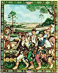 Arguably the best-known rendition of the Jamestown Polish craftsmen is the painting of Poles in Jamestown by Arthur Szyk. The painting was part of a collection in the Polish Pavilion of the New York World Exposition in 1939. It displays 11 Poles, when historical documents state there were "eight Dutchmen and Poles". Historian Arthur Waldo recalled expecting to see only five Poles in the painting, and asked Szyk in-person why he chose to portray 11.[20] Szyk explained that he was inspired to make the painting by a group of historians from the Polish Foreign Office who wanted the painting to be against a summer backdrop.[20]