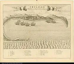 The fleet sighted the Honduras mainland on 11 July. They spent the next three days charting the coastal waters, taking care to remain hidden from sentinels at the Santa Barbara Fortress. On 15 July, two hours past midday, the fleet's ships entered Trujillo's harbour. The fortress immediately engaged the ships, resulting in the expedition's first casualties – four deaths on the Zutphen.[note 3] In the meantime, the fleet's yachts and sloops made their way west of the city, disembarking soldiers at the mouth of the Santo Antonio Creek. This column now marched east, and in short order reached the fortress, which they took after outgunning its men. With the fortress fallen, the city was theirs within two hours. The men rested in Trujillo that night, spending the next morning ransacking the city's residences.[6][7] Total casualties have been stated as 7 among the Dutch[8] and 14 or 15 vecinos among the Spanish.[9]