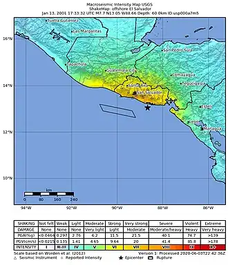 The USGS assigned a maximum intensity of VIII (Severe) for the earthquake, estimating that almost the entirety of El Salvador was exposed to shaking levels exceeding VI (Strong). A USGS seismic installation at La Libertad recorded 0.8188 g in ground acceleration (pga) and 53.2 cm/s (20.9 in/s) in ground velocity.[1] Shaking levels of MMI VI-VII (Strong-Very Strong) were also estimated in parts of Guatemala, Honduras and Nicaragua closest to the epicenter.[9] Shaking was felt as far away as Mexico City and Colombia.[1]