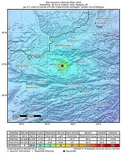 An earthquake measuring Mw  4.9, followed by a 5.3 Mw  mainshock struck Badghis Province, Afghanistan, on January 17, 2022. The earthquake led to a large number of casualties for the tremor's magnitude, with 30 dead and 49 injured.[2][3][4][5][6][7] The earthquake destroyed hundreds of homes in northwestern Afghanistan.[5][3]