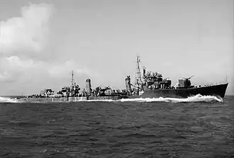 Authorized in the late 1942 Modified 5th Naval Armaments Supplement Program,[7] Maki was laid down on 19 February 1944 at the Maizuru Naval Arsenal and launched on 10 June.[8] Upon her completion on 10 August, Maki was assigned to Destroyer Squadron 11 of the Combined Fleet for training. The ship was assigned to Destroyer Division 43, Escort Squadron 31 of the Combined Fleet on 30 September and participated in the Battle off Cape Engaño on 25 October as part of Vice-admiral Jisaburō Ozawa's Northern Force. During the battle she rescued 150 survivors from the sunken destroyer Akizuki and later attempted to rescue survivors from the light aircraft carrier Chiyoda. Maki was moderately damaged by American aircraft from Task Force 38 that hit her with one bomb and near-missed with several others; the bombs damaged her rudder and limited her speed to 20 knots (37 km/h; 23 mph). The aircraft killed 31 members of Maki's crew and 4 rescuees from Akizuki.[9]