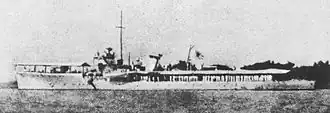 Based in the Kuriles, she patrolled and escorted convoys and ships there. On 7 October 1943, Ishigaki sank the submarine USS S-44. S-44 discovered a target on her radar[3] that she took to be a lone small freighter.[4] S-44 opened fire with her 4-inch deck gun on the refrigerator ship Koko Maru. Ishigaki, Koko Maru's escort, sighted the submarine at 3,300 yards (3,000 m) and opened fire with her bow 4.7-inch gun. Captain Francis Brown of S-44 ordered a crash dive, but Ishigaki scored her first hit on S-44's conning tower before she could submerge. S-44 attempted to fight back with her deck gun, but her gunners were blinded by Ishigaki's 75-centimeter (30 in) searchlight and she scored no hits. Ishigaki then scored her second hit on the submarine's battery section. She then turned and all three 4.7-inch guns began firing at S-44. Soon, she scored several more hits on S-44 which began to sink. Perhaps as many as eight men had made it off the submarine; but only Chief Torpedoman's Mate Ernest A. Duva and Radioman Third Class William F. Whitemore were picked up by Ishigaki.[4]