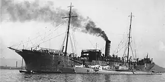 At the end of 1904, Karasaki Maru was sent to the Yokosuka Naval Arsenal for conversion into a submarine tender. She was officially commissioned into the Imperial Japanese Navy on 4 July 1905. On 8 March 1906, she was renamed Karasaki, and was officially re-designated as a torpedo boat tender.[2] In August 1912, the Imperial Japanese Navy abolished the torpedo boat tender classification, and Karasaki was re-designated as a second-class kaibokan. However, the designation of torpedo boat tender was revived in April 1920. From 1924, Karasaki was then assigned to the submarine training school at Kure Naval District, and from 1 December 1924, was again officially designated as a submarine tender.