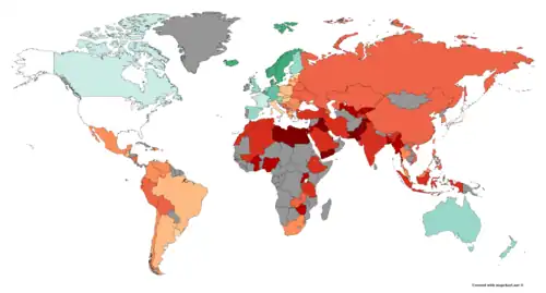 Countries colored according to the difference from Japan on the index of emancipative values.[1]